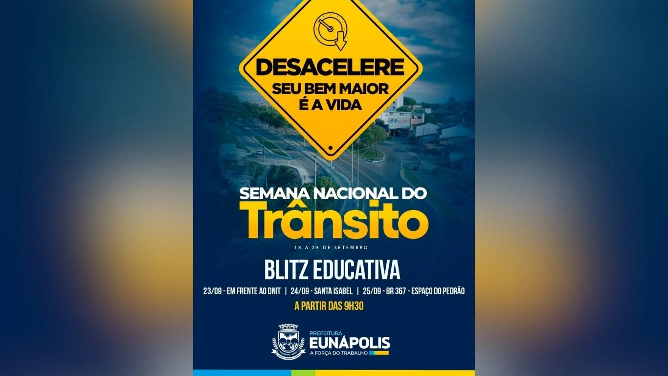 Em comemoração à Semana Nacional do Trânsito, celebrada de 18 a 25 de setembro, a Prefeitura de Eunápolis, por meio do Núcleo Municipal de Trânsito e Transportes, realiza uma série de blitze educativas com foco na conscientização, segurança e respeito no trânsito. As ações acontecem nos dias 23, 24 e 25 de setembro, sempre às 9h30 da manhã, em locais de grande circulação.