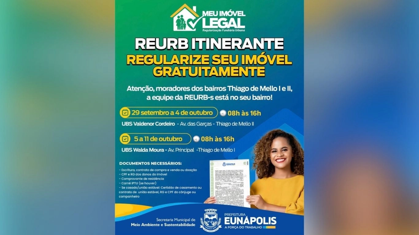 A Prefeitura de Eunápolis, por meio da Secretaria de Meio Ambiente e Sustentabilidade, inicia nesta segunda-feira, 29 de setembro, um mutirão de atendimentos do Programa de Regularização Fundiária Urbana (REURB) nos bairros Thiago de Melo I e II.