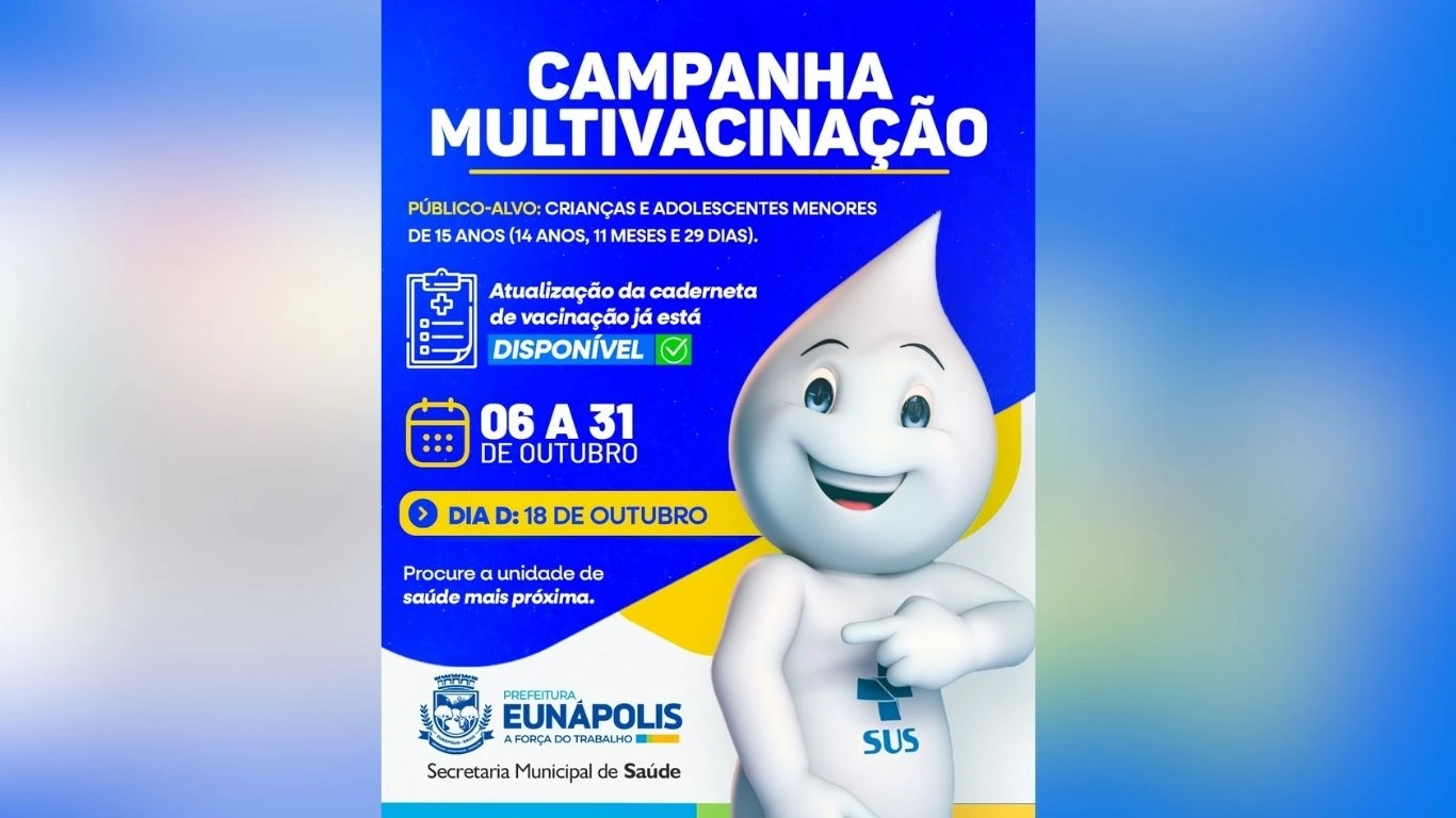 A Prefeitura de Eunápolis, por meio da Secretaria Municipal de Saúde, começou nesta segunda-feira, 6, a Campanha Nacional de Multivacinação, que vai até o dia 31 de outubro. O objetivo é simples e importante: atualizar a caderneta de vacinação de crianças e adolescentes com menos de 15 anos, protegendo nossos jovens contra várias doenças que podem ser evitadas com vacina.