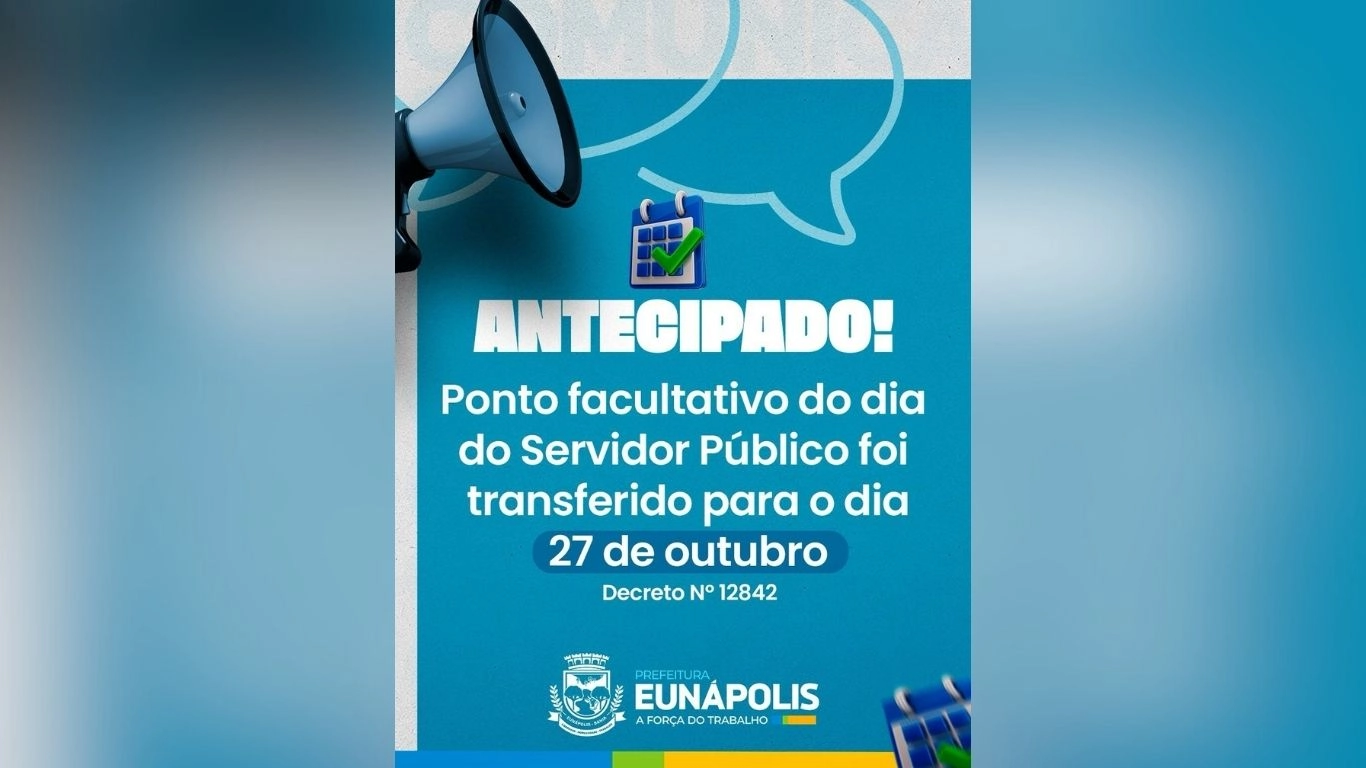 A Prefeitura de Eunápolis informa que o ponto facultativo referente ao Dia do Servidor Público, tradicionalmente celebrado no dia 28 de outubro, será antecipado para a segunda-feira (27), conforme estabelece o Decreto Municipal nº 12.842/2025. A medida abrange os servidores da administração pública municipal direta e indireta do Poder Executivo.