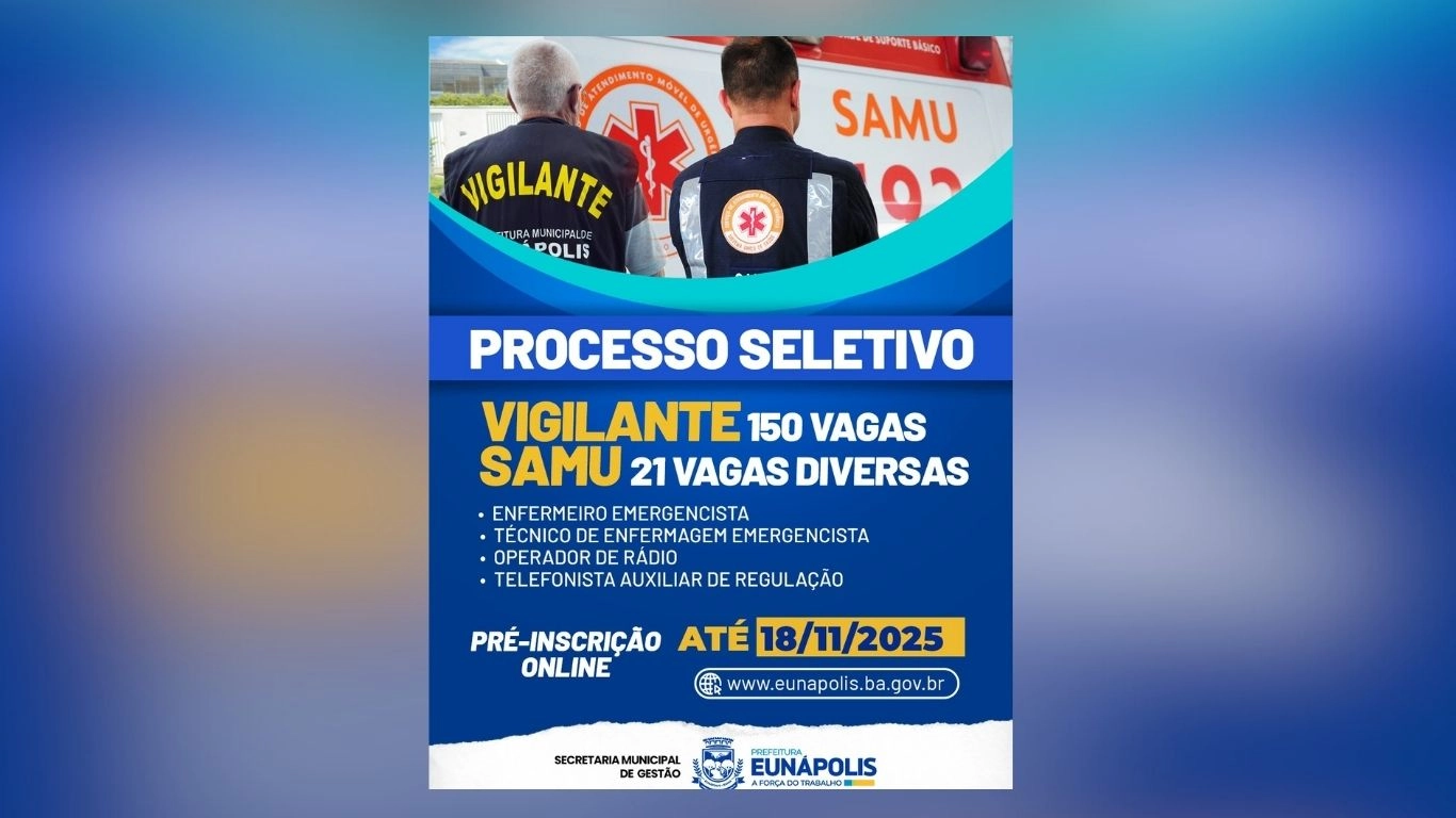 A Prefeitura de Eunápolis anunciou a abertura de dois Processos Seletivos Simplificados com o objetivo de contratar profissionais temporários para atender diferentes áreas do serviço público. O Processo Seletivo Edital 006/2025 oferece 150 vagas para Vigilantes, enquanto o Processo Seletivo Edital 007/2025 destina 21 vagas para o SAMU 192, com cargos de enfermeiro, técnico de enfermagem, operador de rádio e telefonista auxiliar de regulação. Ambos os processos seletivos são regidos pelo Regime Especial de Direito Administrativo (REDA) e têm jornada de trabalho de 40 horas semanais.
