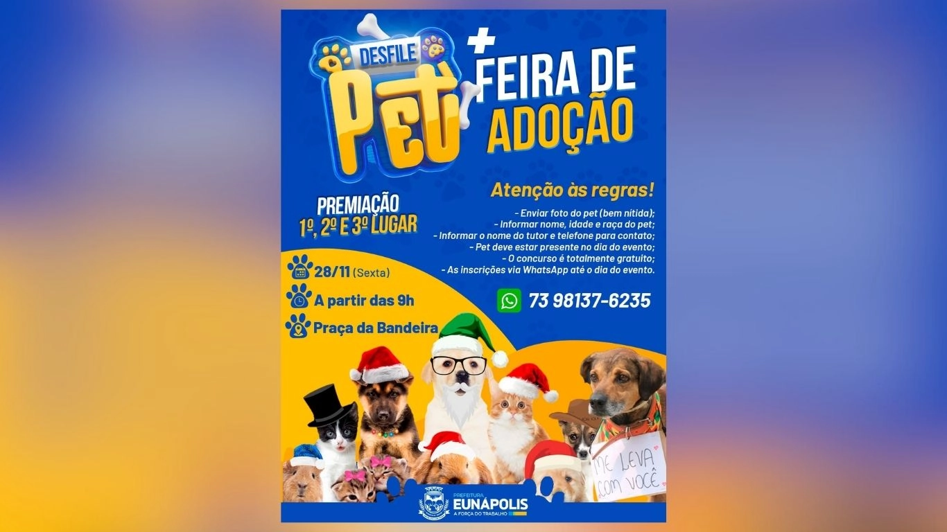 A Prefeitura de Eunápolis, por meio da Unidade de Vigilância de Zoonoses (UVZ), realiza nesta sexta-feira (28) a 2ª Grande Feira PET, das 9h às 17h, na Praça da Bandeira. A ação reúne serviços essenciais para tutores e incentiva a adoção responsável de animais.